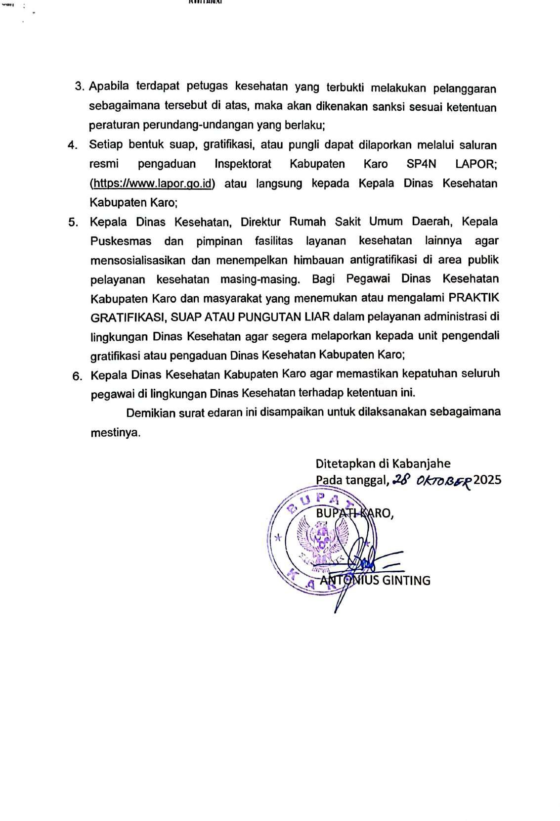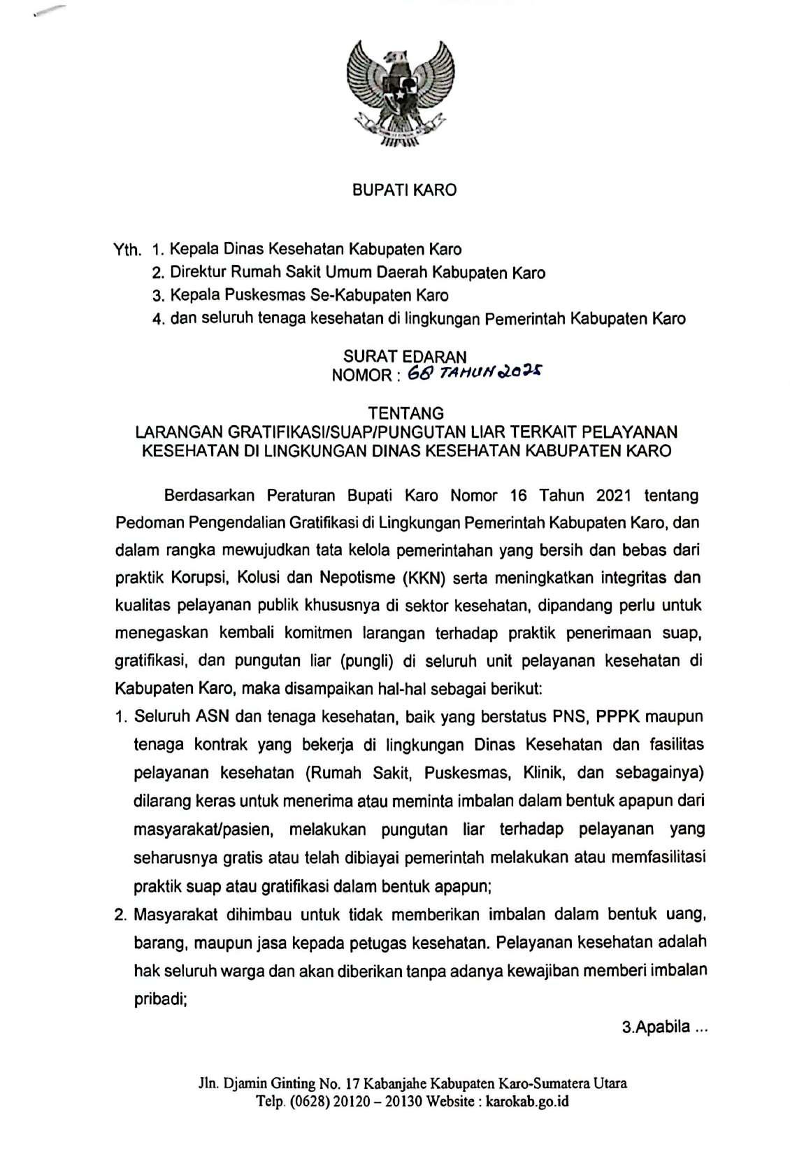 Keluarnya Surat Ederan Bupati, 28 Oktober 2025 mengenai LARANGAN GRATIFIKASI/SUAP/SUAP/PUNGUTAN/ LIAR TERKAIT PELAYANAN KESEHATAN DI LINGKUNGAN DINAS KABUPATEN KARO, berdasarkan Peraturan Bupati Karo Nomor 16 Tahun 2021 tentang Pedoman Pengendalian Gratifikasi di Lingkungan Pemerintah Kabupaten Karo, dan dalam rangka mewujudkan tata kelola pemerintahan yang bersih dan bebas dari praktik Korupsi, Kolusi dan Nepotisme (KKN) serta meningkatkan integritas dan kualitas pelayanan publik khususnya di sektor kesehatan, di pandang perlu untuk menegaskan kembali komitmen larangan terhadap praktik penerimaan suap, gratifikasi, dan pungutan liar (pungli) di seluruh layanan unit pelayanan kesehatan di Kabupaten Karo